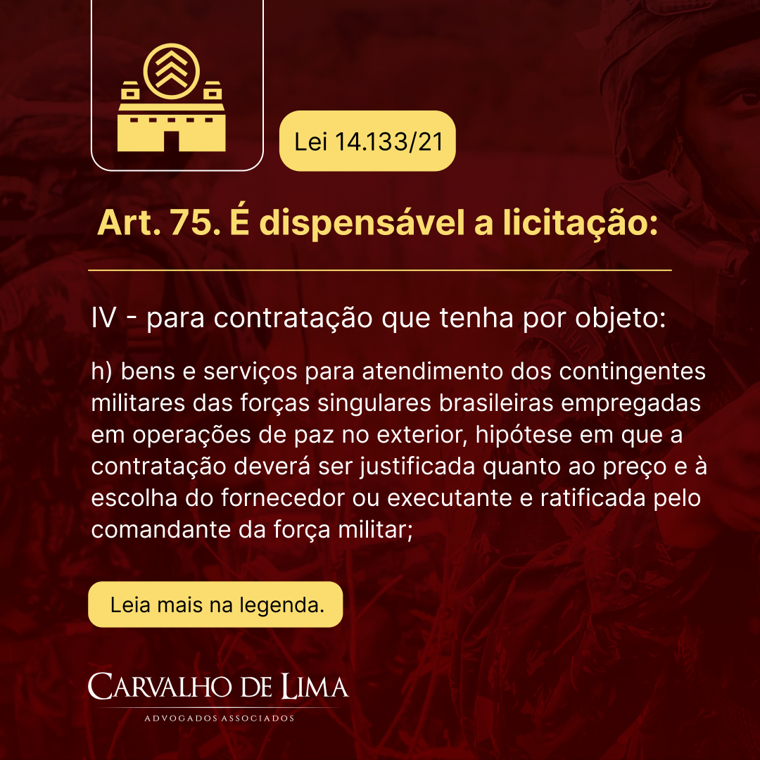 O Artigo 75 da Lei nº 14.133/2021 estabelece as diretrizes e condições para a contratação de bens e serviços destinados ao atendimento dos contingentes militares das forças singulares brasileiras empregadas em operações de paz no exterior. Em seu texto, a alínea h) merece destaque, pois trata especificamente dessa modalidade de contratação e impõe certas exigências e procedimentos a serem seguidos.